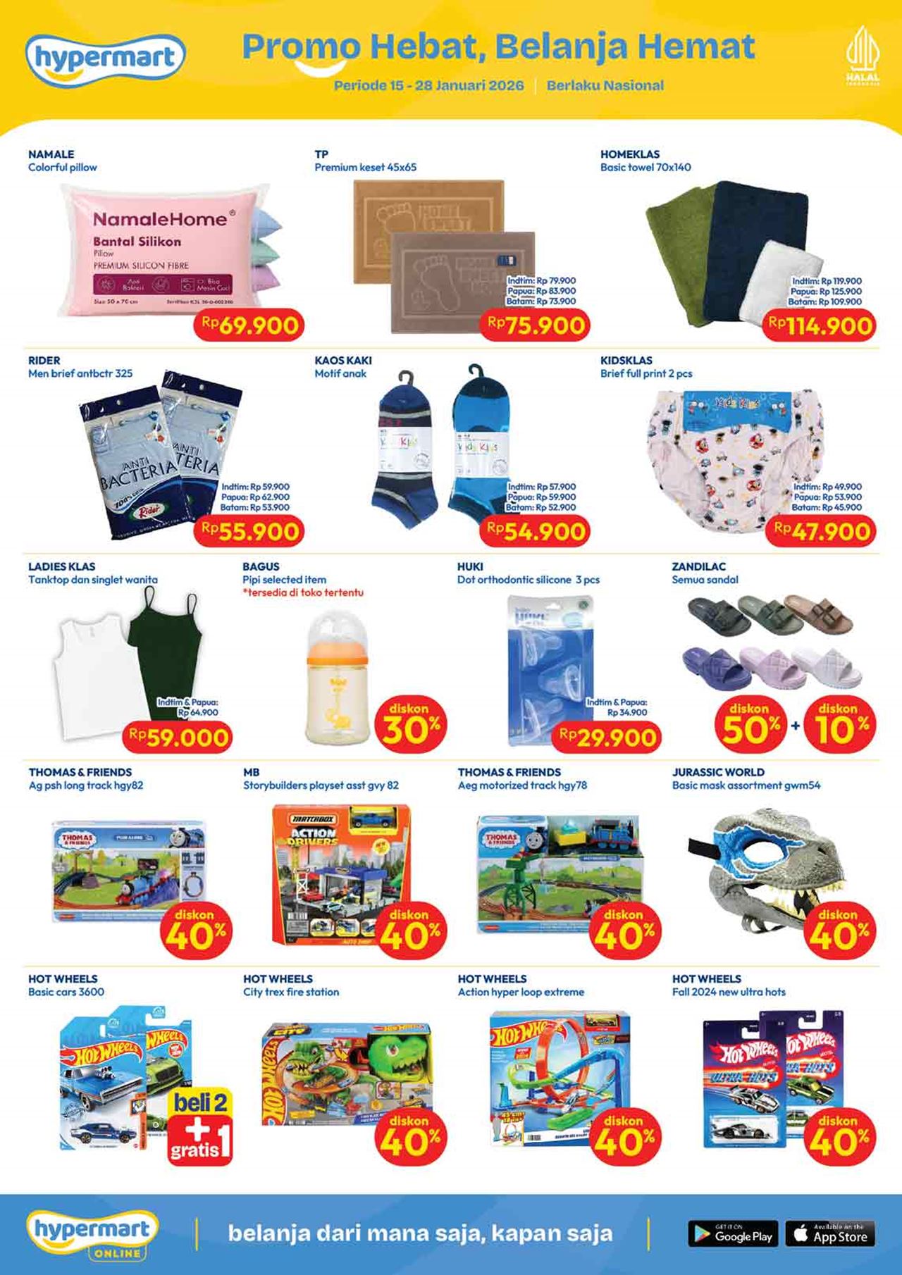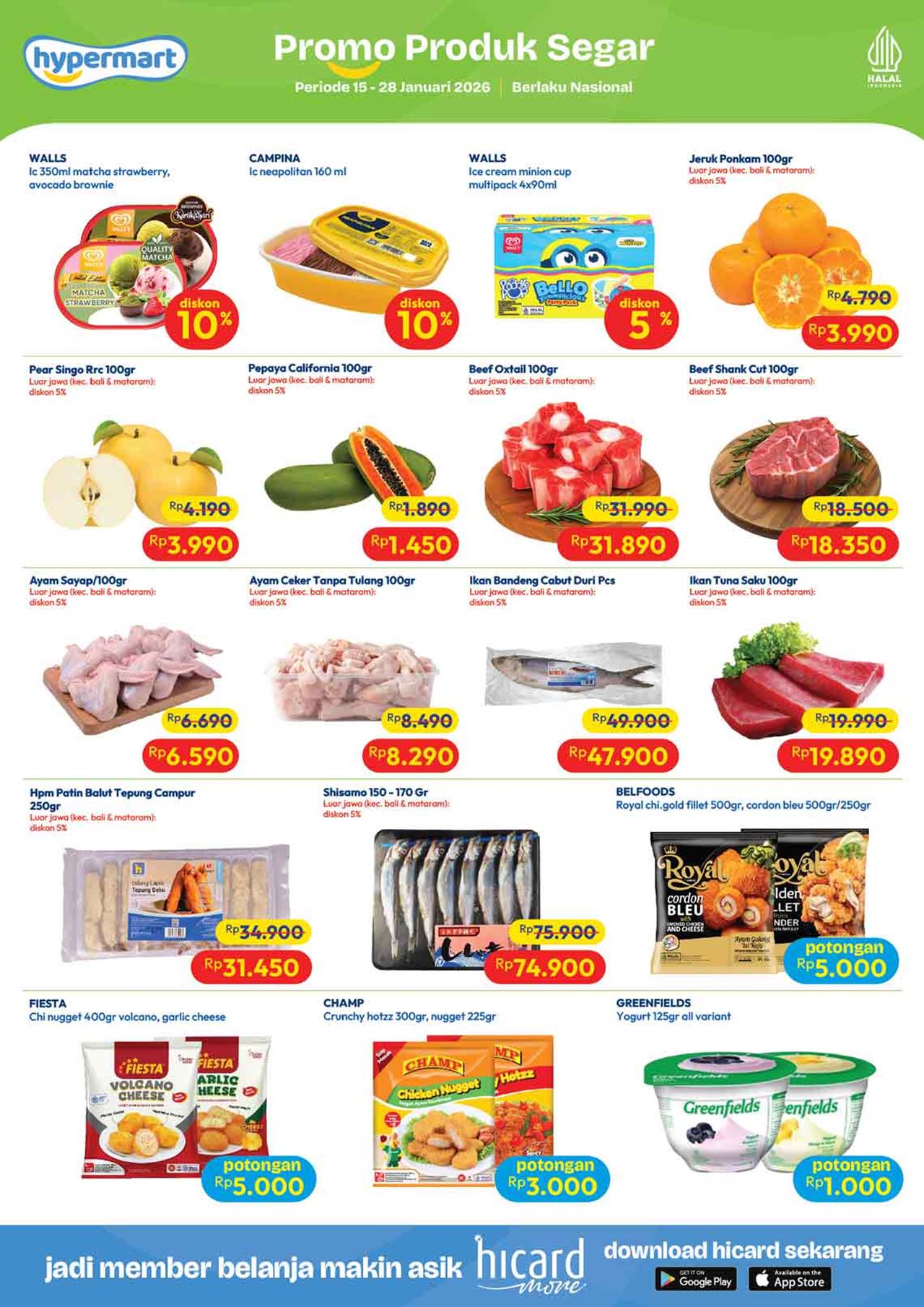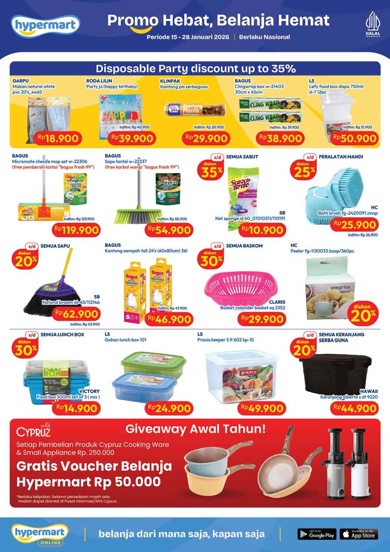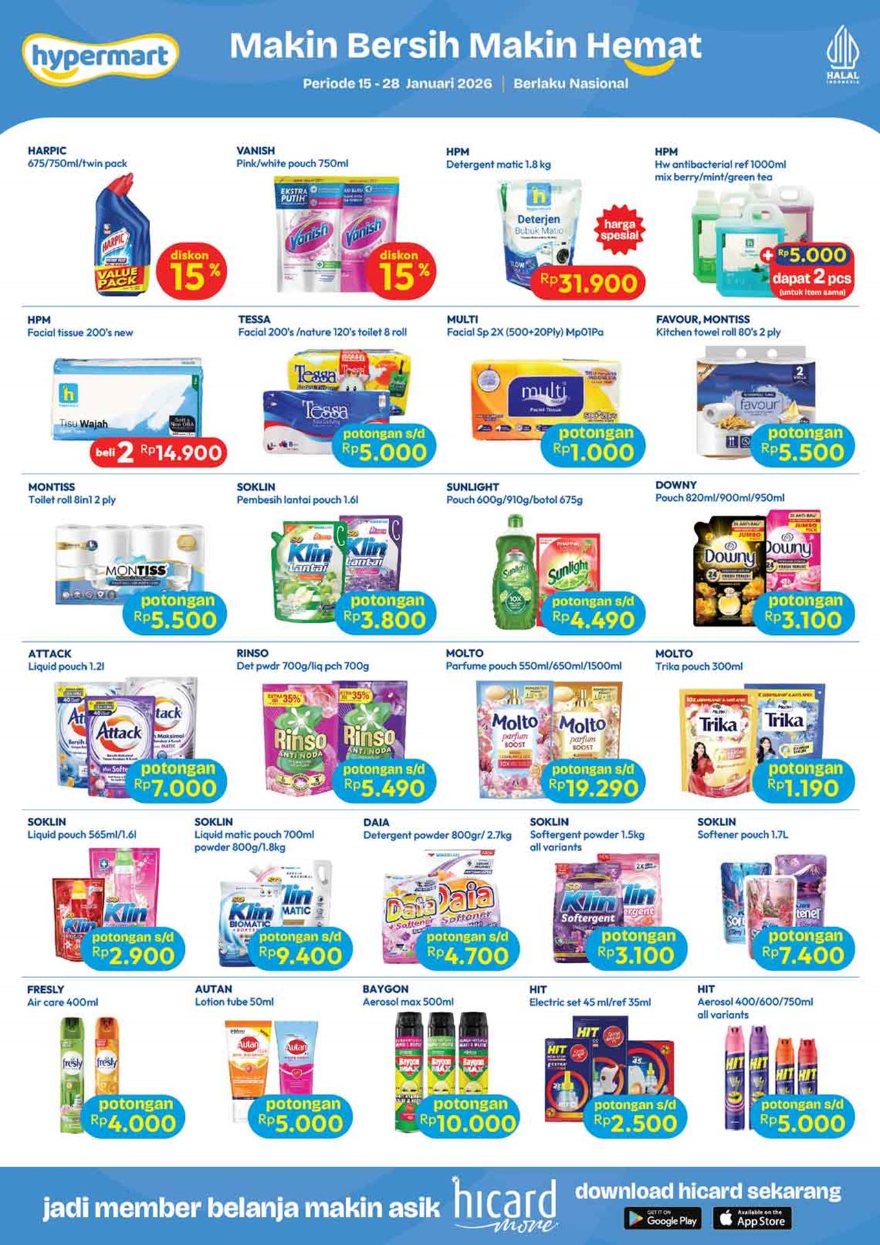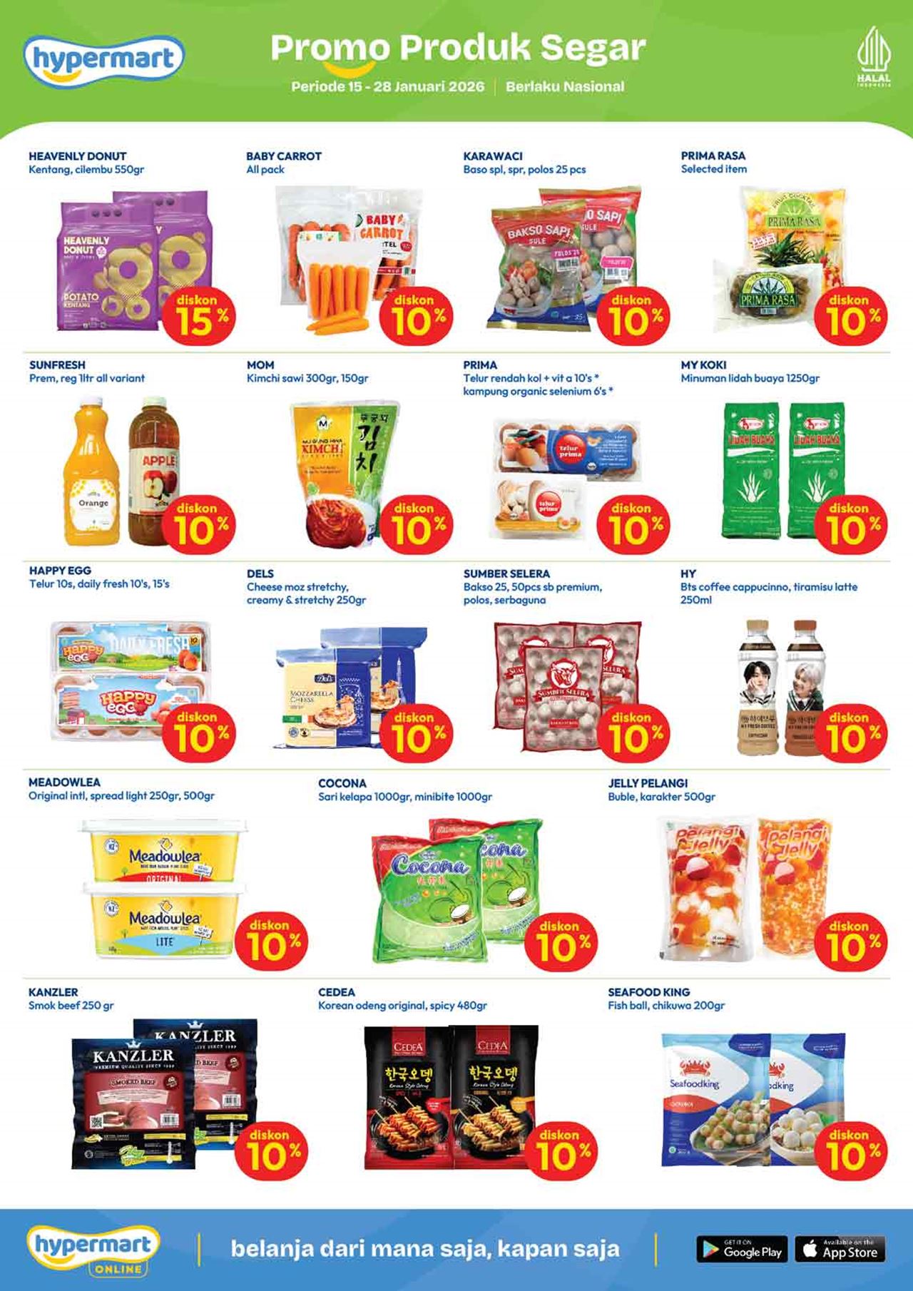 Temukan penawaran spesial untuk berbagai kebutuhan harian mulai dari buah-buahan, daging, nugget, sosis, susu kotak, snack, minuman, berbagai kebutuhan bayi dan anak (popok / diapers / pampers, susu anak, minyak telon dan minyak katu putih), sabun mandi, sabun cuci, shampoo, sampai dengan perlengkapan rumah dan peralatan elektronik dalam katalog terbaru Hypermart yang berlaku selama 2 minggu ke depan.