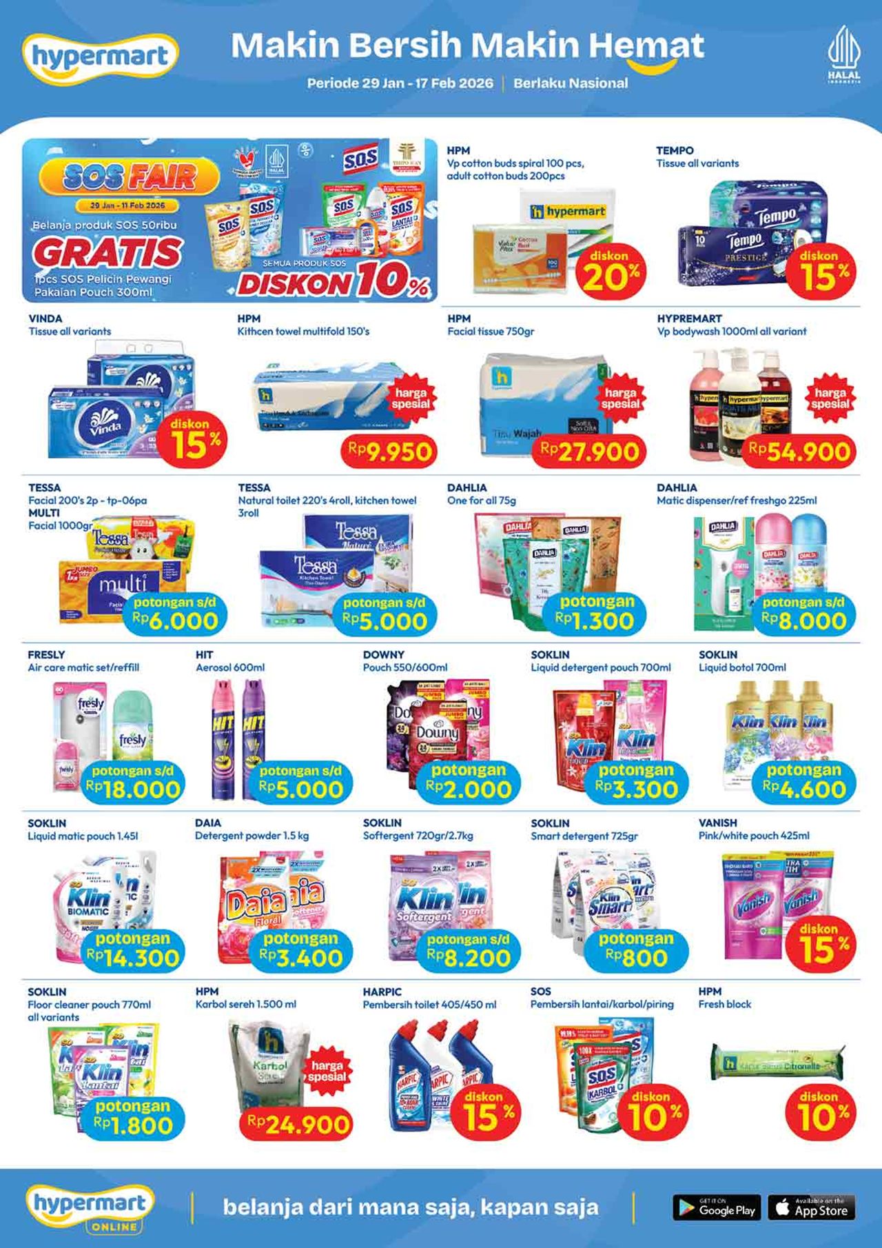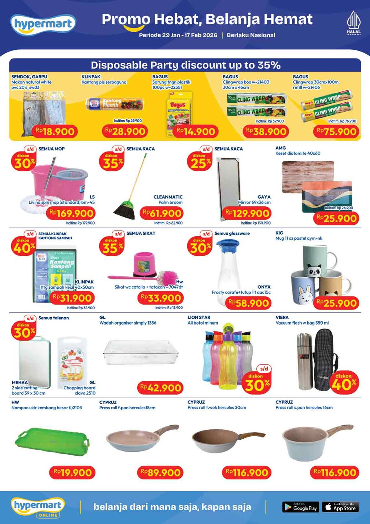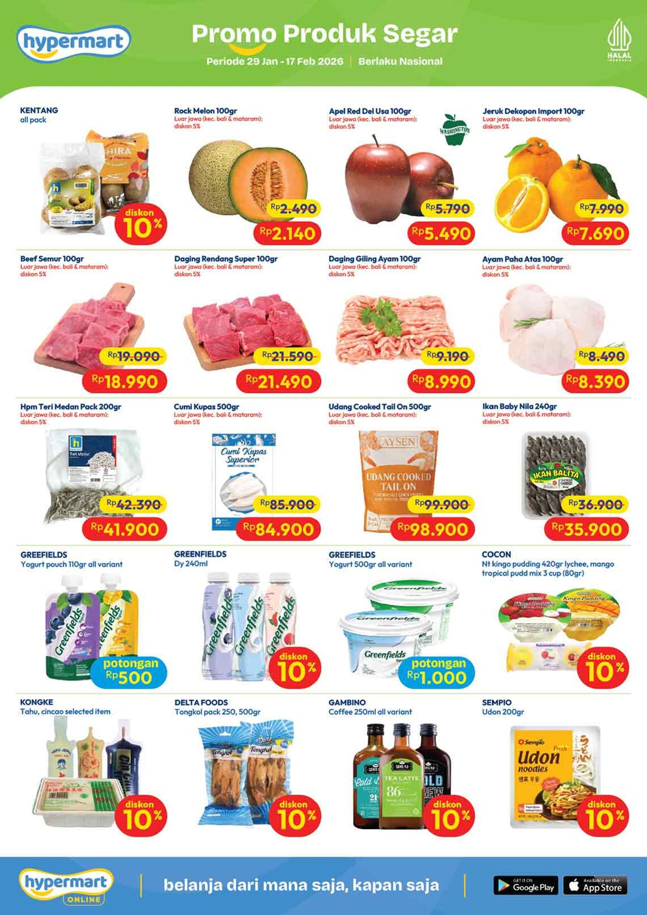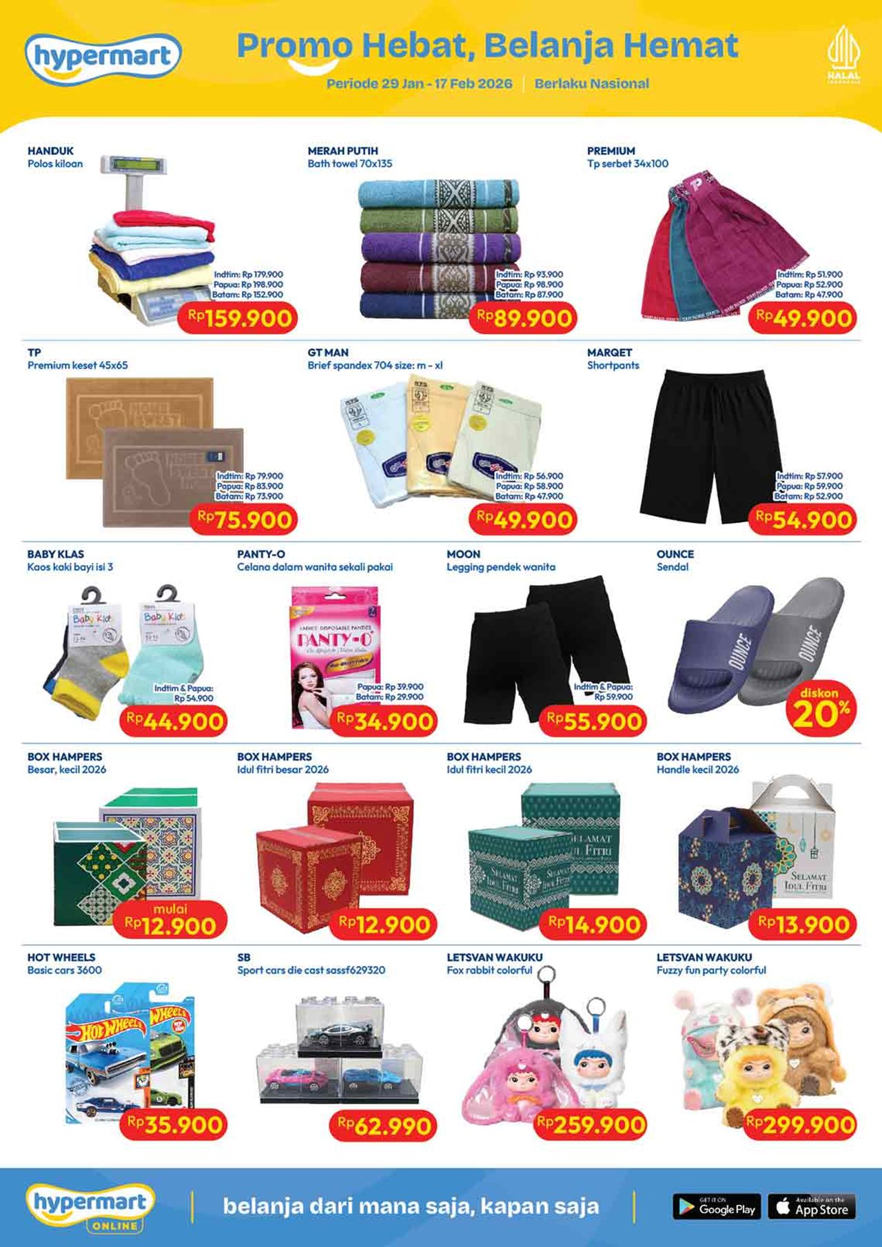 Temukan penawaran spesial untuk berbagai kebutuhan harian mulai dari buah-buahan, daging, nugget, sosis, susu kotak, snack, minuman, berbagai kebutuhan bayi dan anak (popok / diapers / pampers, susu anak, minyak telon dan minyak katu putih), sabun mandi, sabun cuci, shampoo, sampai dengan perlengkapan rumah dan peralatan elektronik dalam katalog terbaru Hypermart yang berlaku selama 2 minggu ke depan.
