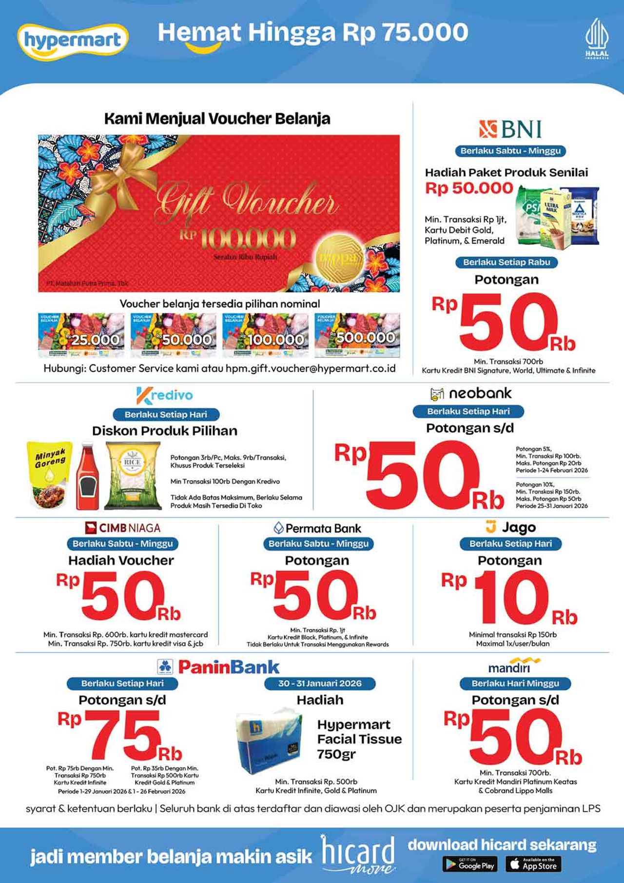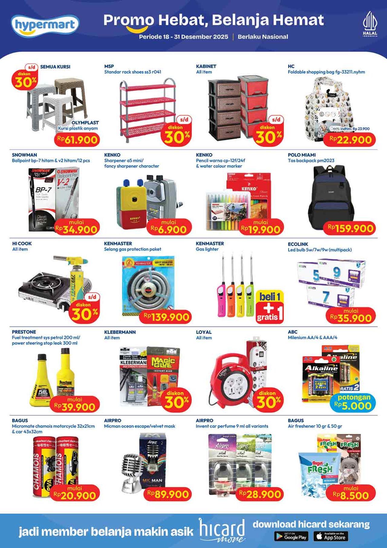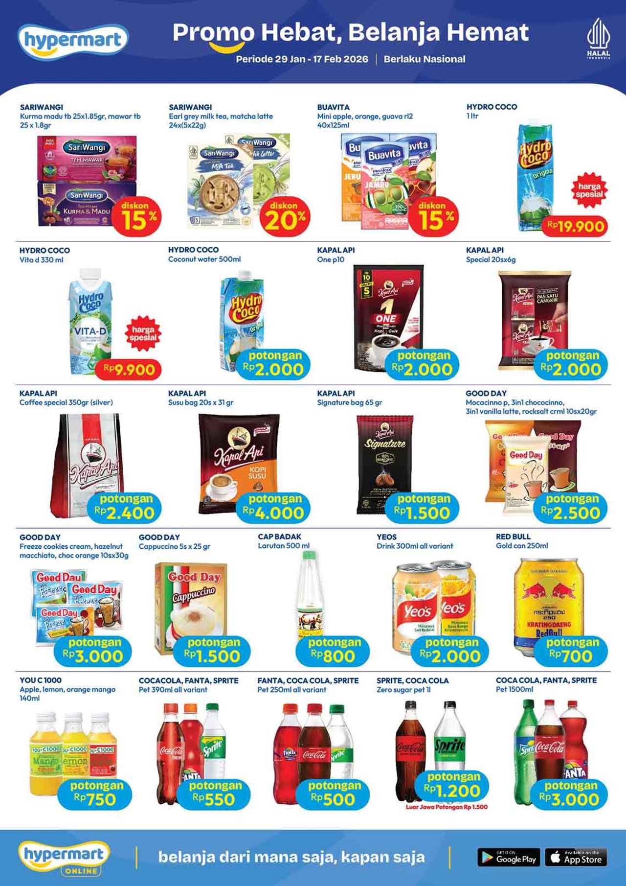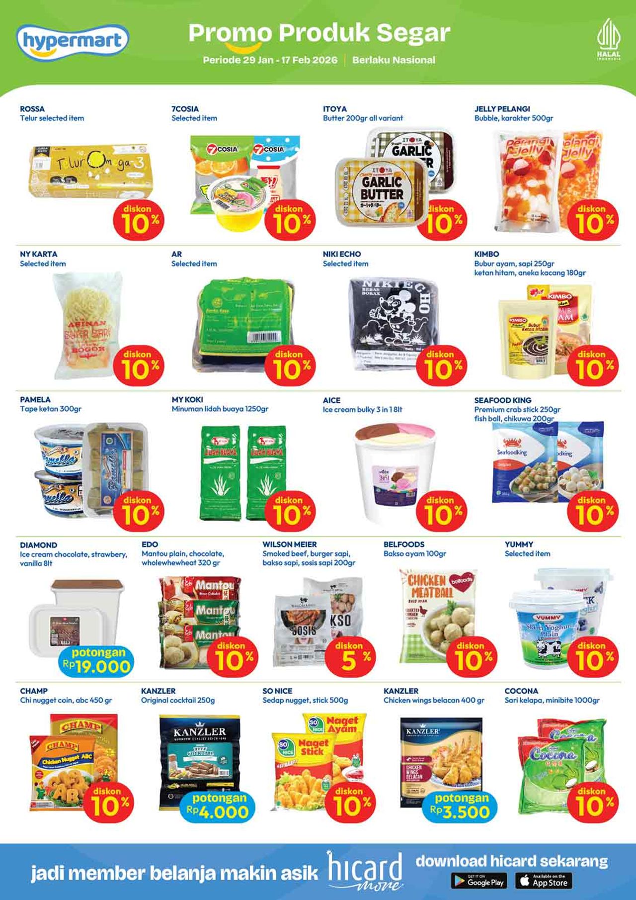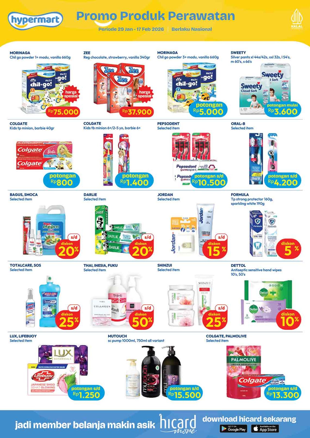 Temukan penawaran spesial untuk berbagai kebutuhan harian mulai dari buah-buahan, daging, nugget, sosis, susu kotak, snack, minuman, berbagai kebutuhan bayi dan anak (popok / diapers / pampers, susu anak, minyak telon dan minyak katu putih), sabun mandi, sabun cuci, shampoo, sampai dengan perlengkapan rumah dan peralatan elektronik dalam katalog terbaru Hypermart yang berlaku selama 2 minggu ke depan.