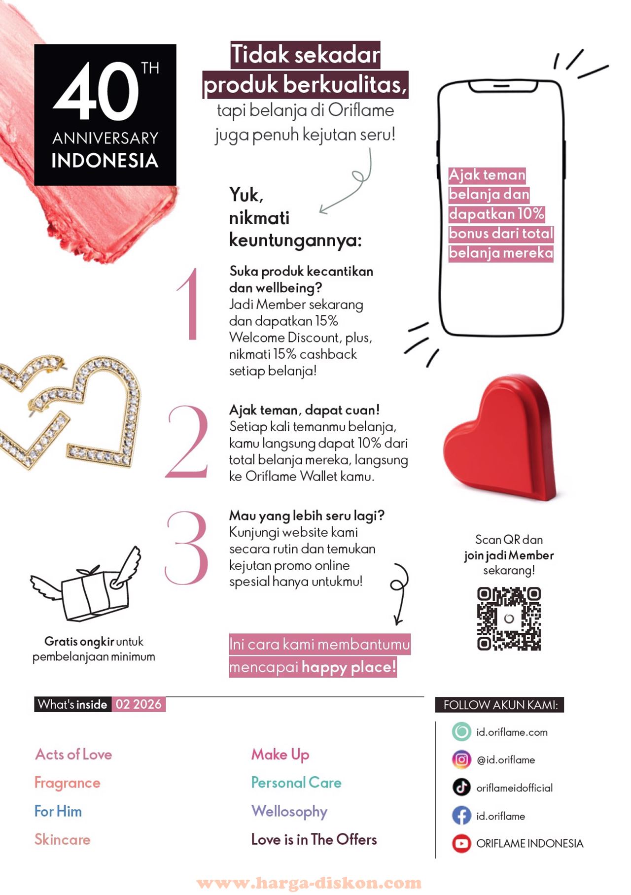 Temukan berbagai promo menarik produk kecantikan (parfum, lipstik, foundation, body cream, body lotion, shower gel, maskara, eye shadow, dan lain-lain) dalam katalog Oriflame terbaru edisi Februari 2026
